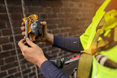 Industrial rope access abseiler inspector worker inspecting fall arrester energy shock absorbing lanyard secondary backup device on rope prior to used abseiling on site