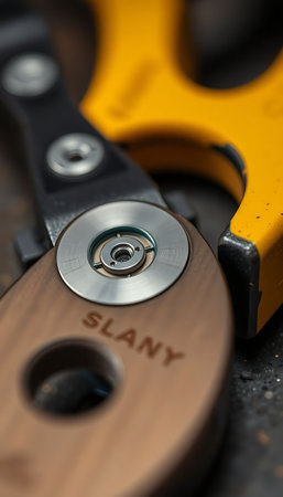 Close-up view of a metal grip tool resting on a workbench, showcasing intricate details in design and engineering, perfect for illustrating precision workmanship.