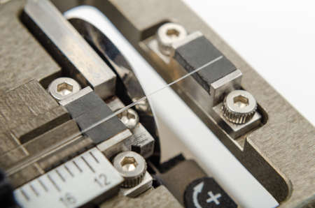 The stripped optical fiber lies in the optical fiber cleaver, close-up