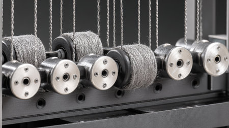 This close-up image showcases an array of metallic spools of wire arranged on a modern industrial machine used in textile manufacturing, highlighting intricate details.