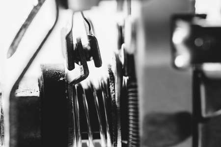 Old mechanism with pinions. Retro style black and white. Macro photo.