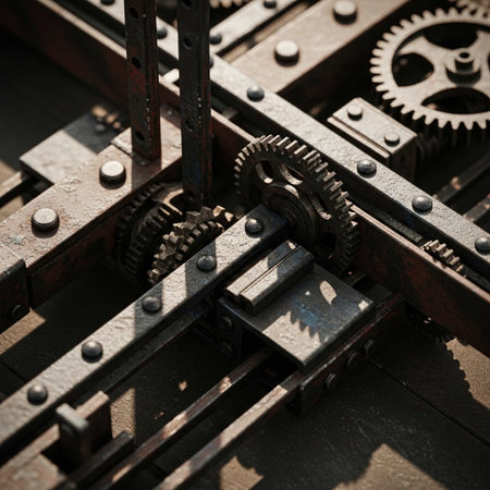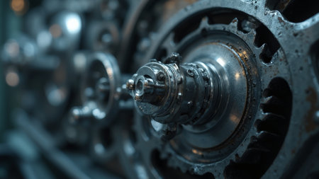 Close-up of metallic gears and machinery with industrial focus.