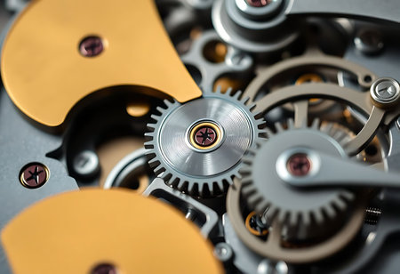 Mechanical parts close-up An intricate close-up of interlocking gears and cogs in motion, their polished metallic surfaces gleaming under soft golden light. Every