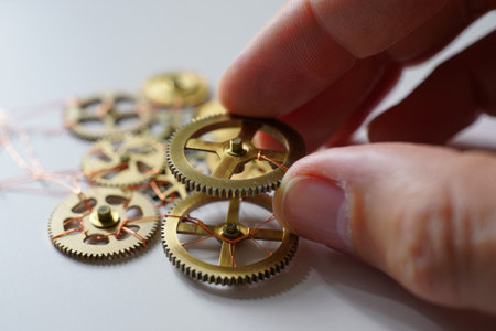 Close-up of hands meticulously assembling intricate gears and cogs of a mechanical device