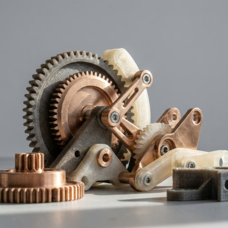 A detailed still life of a complex mechanical prototype, showcasing a fusion of 3D-printed plastic and polished copper gears and linkages against a clean, neutral background.