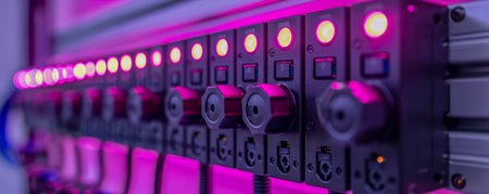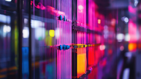 Network server rack with connected cables and flashing lights illuminating the scene with vivid colors