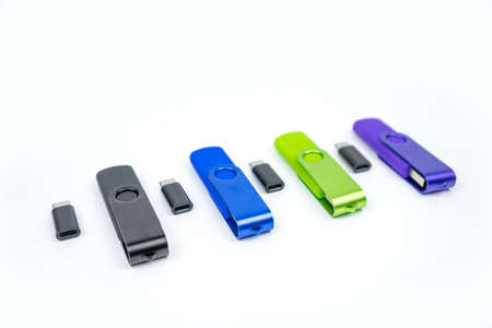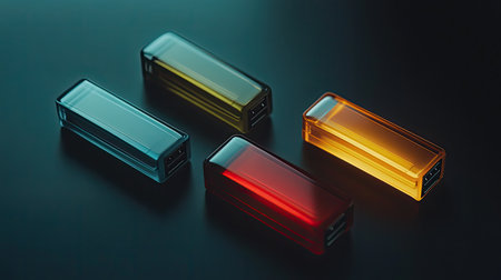 Vibrant USB flash drives in blue, green, red, and orange showcase modern technology and digital storage solutions against a sleek black backdrop.