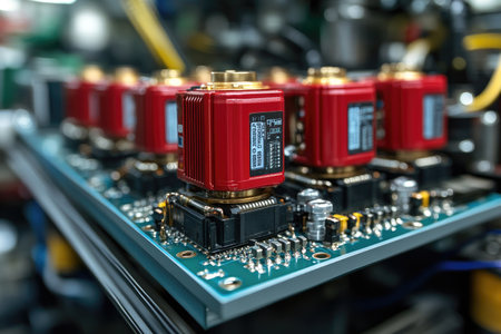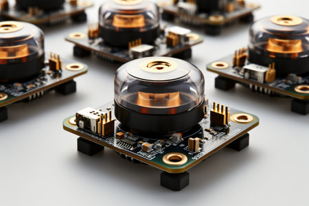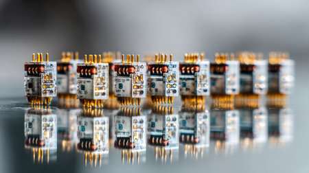 This close-up image features electronic components arranged in a precise pattern, reflecting on a glossy surface, showcasing intricate circuitry and craftsmanship.