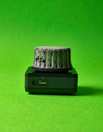 A modern electronic device with a unique, textured control knob is isolated against a bold green background.