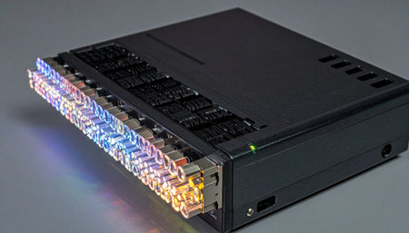 A high-density network switch hums with activity, its fiber optic ports glowing with a vibrant spectrum of colors.