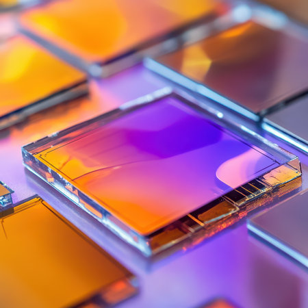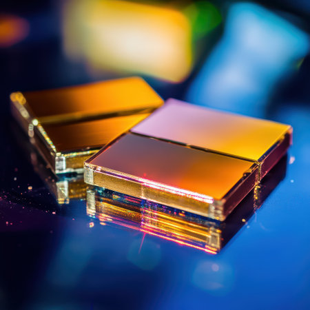Shiny reflective squares rest on a glossy surface showcasing vibrant colors and intricate patterns under bright lighting.