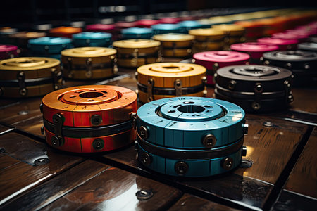 This image features a stunning display of circular objects reflecting colorful light in a dark setting, creating a captivating abstract composition.