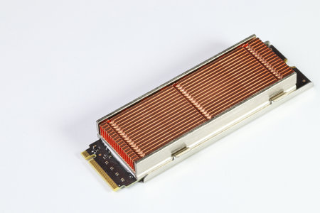 Solid state drives with copper heat sink for computer - ssd sata, NVME PCIe, SATA SSD m key, b key isolated on white background.
