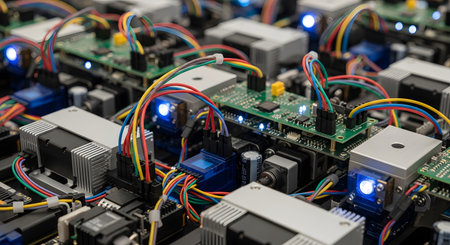 A close-up, detailed shot of a complex assembly of electronic components, including circuit boards, microchips, heat sinks, and a dense network of colorful wires. Blue LED lights are glowing on some of the boards, indicating that the system is active. The image represents the complexity of modern electronics, computer hardware, and technology.