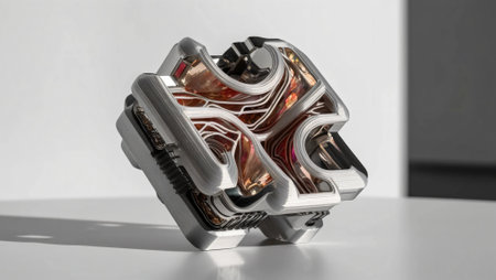 Close-up of a 3D-printed object, intricate design with metallic and translucent materials