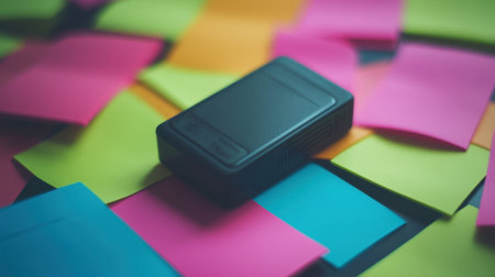 A minimalistic black device is placed amidst vibrant sticky notes, showcasing a creative and organized workspace. Ideal for themes of productivity and innovation.