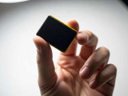 The image features a hand holding a small, rectangular object with black and yellow colors. The object appears to be a gadget or device. The image is set against a white background, making the object stand out clearly. This image is ideal for product showcases or tech-related content.