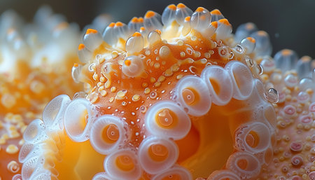 A detailed macro photograph showcasing the mesmerizing texture of an octopus tentacle adorned with glistening water droplets, set against a dark backdrop.