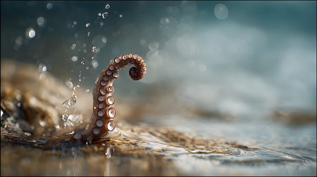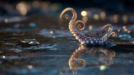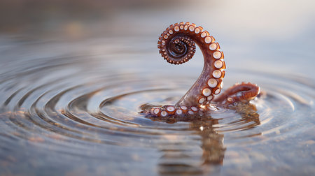 A majestic giant octopus tentacle emerges from deep water during sunrise, enhancing the tranquil atmosphere with its elegant form.