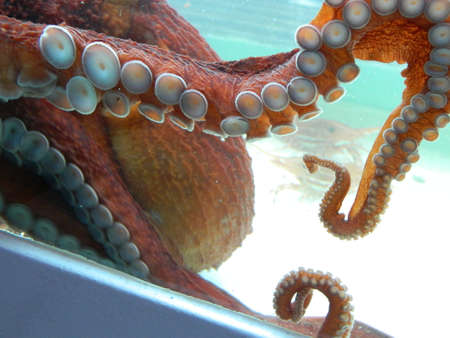 Octopus arms with suckers closeup attached on aquarium glass. Artistic background