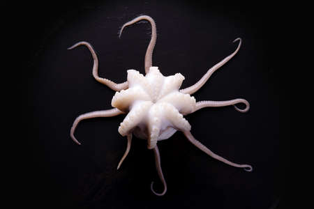 Cut fresh raw octopus on black mirror surface, closeup. Space for text