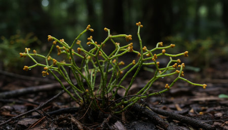 Tiny pin-like fungi or lichen growing on shady bank in close-up micro-landscape on New Zealand West Coast.