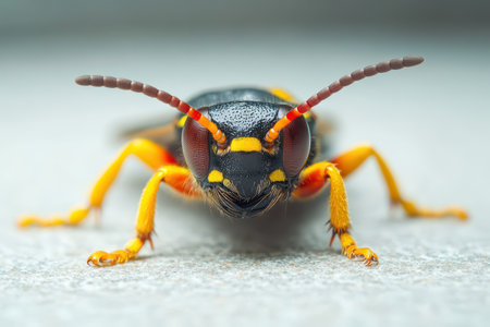 A vividly colored insect with distinct yellow and black markings is perched on a surface.
