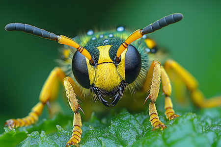 Intense macro shot of a wasp perched on a green leaf, its vivid yellow and black coloring, detailed antennae, and textured body. captures the intricate features and natural habitat of this striking insect. Generative AI