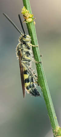 Portrait of a yellow wasp in nature. Macro