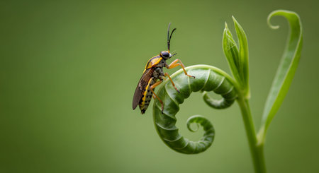 A yellow and black insect perched delicately on a curling green plant tendril. The spiral shape of the plant and the insect's detailed features are set against a smooth green bokeh background.