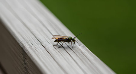 Detailed closeup on a colorful green sawfly,Tenthredo mesomela on a piece of wood