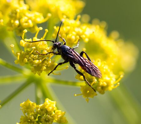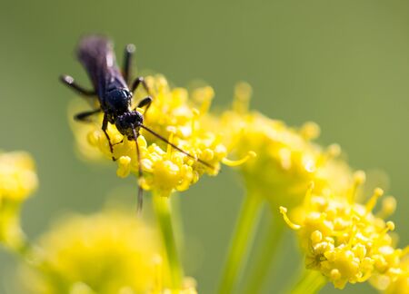 Wasp on yellow flower in nature. macro