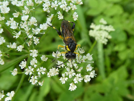 Closeup of a small wasp on wild white flowers