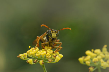 Macro portrait of a polistes dominula wasp on a flower