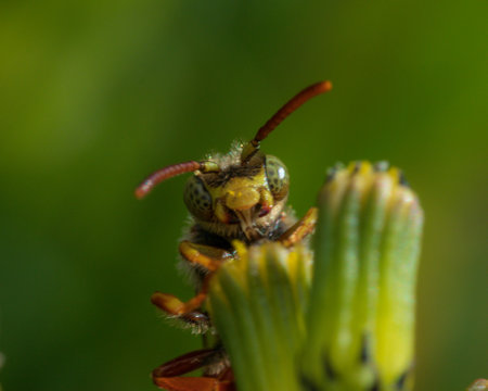 Natural facial closeup on a French paperwasp, Polistes dominula, sitting on an unopened Tansy flower.