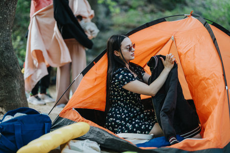 Young woman preparing inside an orange camping tent outdoors in a forested area