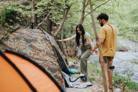 happy couple setting up tent outdoors