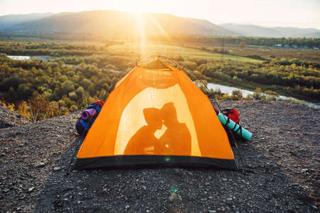 The concept of travel, tourism and relationships. Silhouette of a young man and his girlfriend who kisses each other in a orange tent on the top of the mountain at sunset.