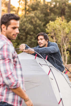Two men putting up tent together in forest, Deer Park, Cape Town, South Africa