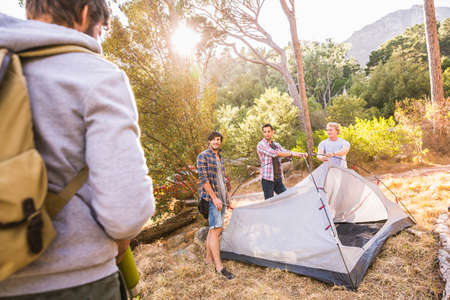 Four men putting up dome tent in forest, Deer Park, Cape Town, South Africa