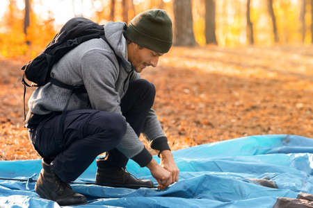 Young man backpacker setting tent, camping at golden forest, copy space