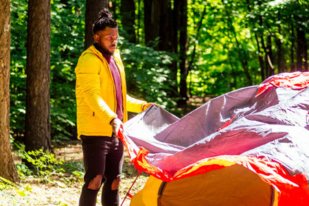 african american in yellow jacker putting on a tent in forest