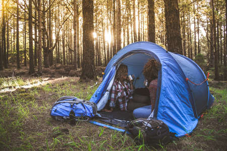 Couple of young trendy women drinking coffee and tea sitting in a camping tent Trendy sporty girls relaxing in the forest after an hiking holiday Tourism adventure active lifestyle and healthy concept