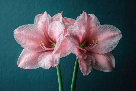 A blooming pink amaryllis plant against a neutral-toned background.