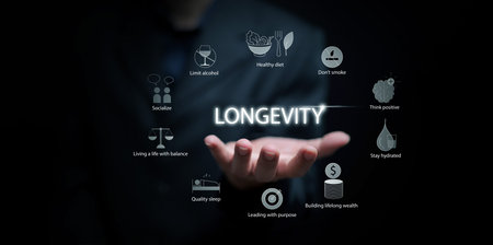 Conceptual design illustrating longevity habits such as no smoking, limiting alcohol, socializing, life balance, quality rest, and purpose-driven living for sustainable wellness.