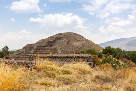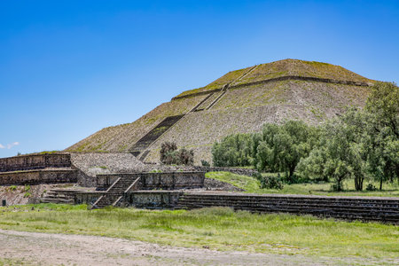 Ruins of the architecturally significant Mesoamerican pyramids and green grassland located at at Teotihuacan, an ancient Mesoamerican city located in a sub-valley of the Valley of Mexico