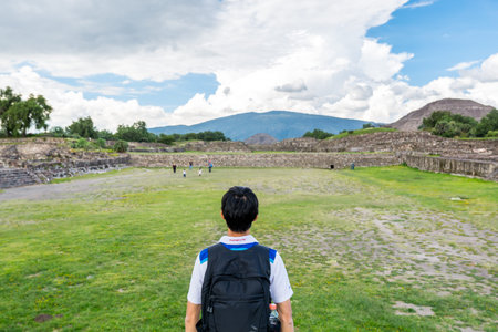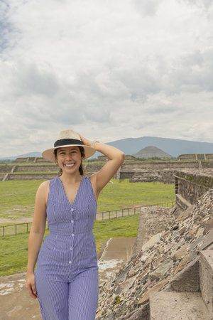 A chinese tourist in the ruins of the architecturally significant Mesoamerican pyramids and green grassland located at at Teotihuacan, an ancient Mesoamerican city located in a sub-valley of the Valley of Mexico