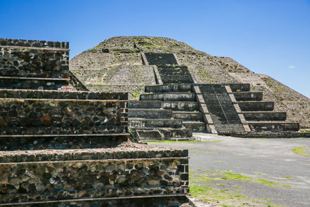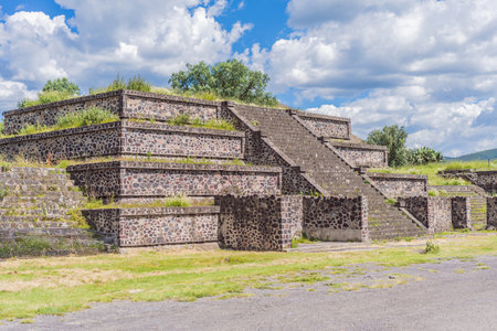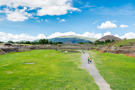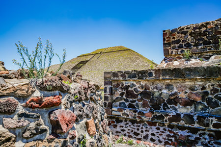 Ruins of walls and foundation of the architecturally significant Mesoamerican pyramids and green grassland located at at Teotihuacan, an ancient Mesoamerican city located in a sub-valley of the Valley of Mexico