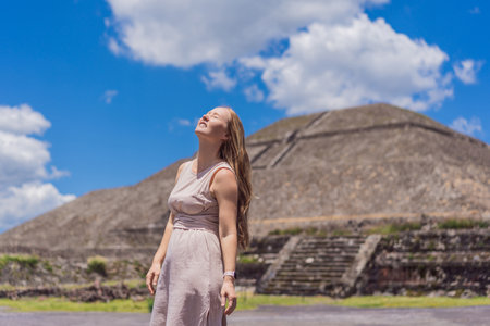 Female tourist standing in front of Teotihuacan pyramids in Mexico, enjoying sightseeing, adventure, and cultural heritage. Travel, tourism, and exploration concept