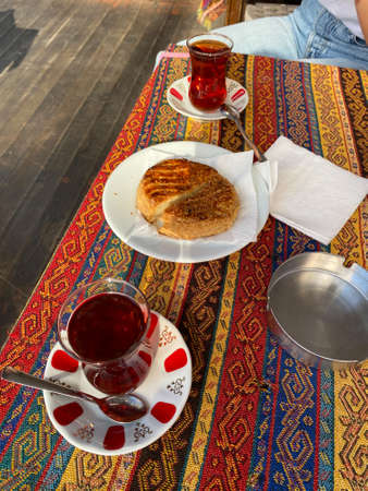 Traditional Turkish Tea with Tahini Pide at Local Restaurant. Ready to Eat.